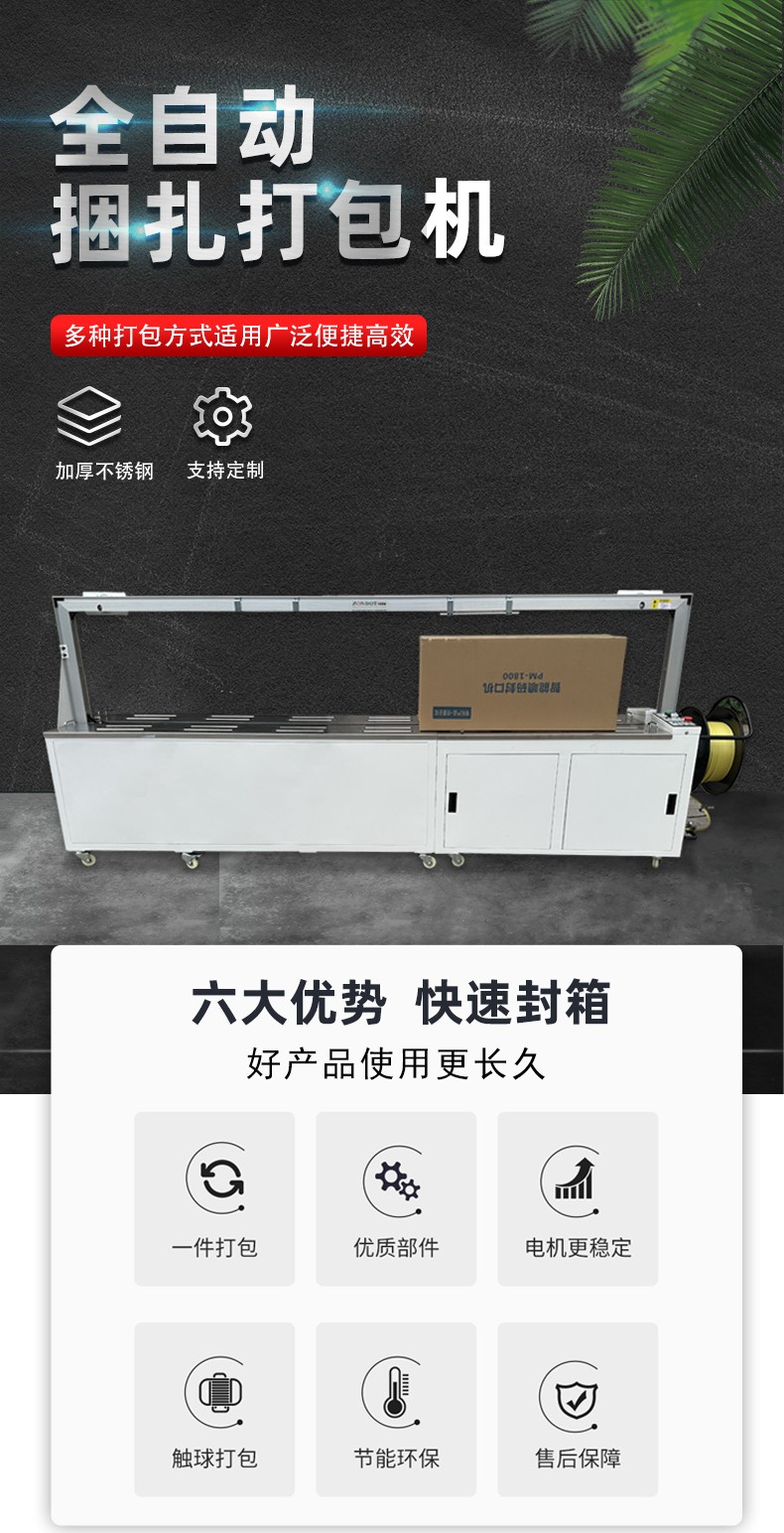 - 高效快速:全自動打包機的打包速度堪稱行業翹楚,部分高性能機型每分鐘可輕松完成 15 - 25 次打包操作 。以物流倉儲行業為例,在大型物流中心,每天有成千上萬件包裹需要打包處理。傳統人工打包方式不僅效率低下,還容易因疲勞導致打包質量參差不齊。而全自動打包機投入使用后,包裹在傳送帶上源源不斷地被輸送至打包區域,設備以極高的速度自動完成送帶、環繞、加熱封口等一系列動作。每小時能處理數百件包裹,使得物流中心的包裹打包效率大幅提升,有效緩解了貨物積壓問題,加快了貨物的流轉速度 。