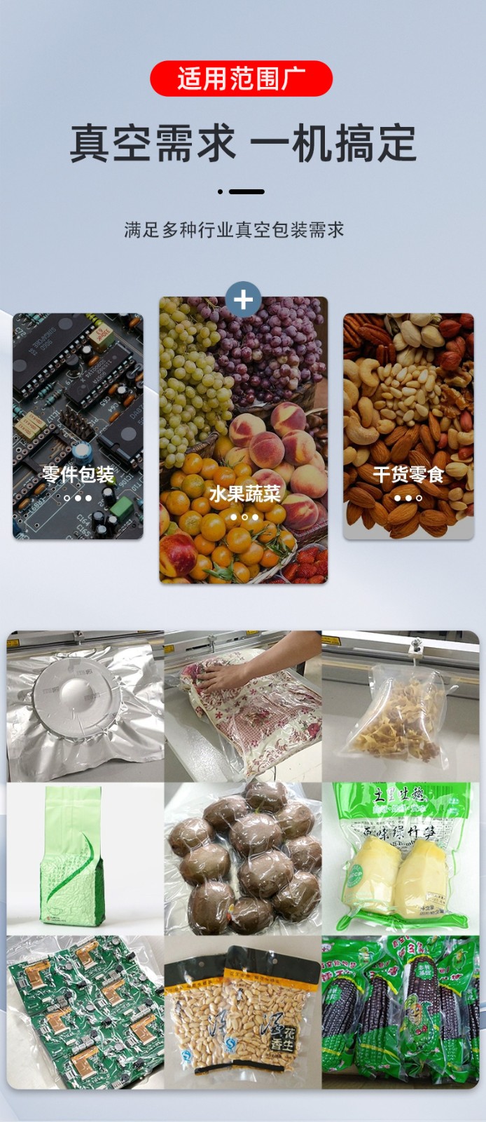 - 工業領域:可真空包裝大型機械零件(防銹)、整箱電子元件(防塵),部分機型支持調節抽真空力度,避免損壞精密組件。