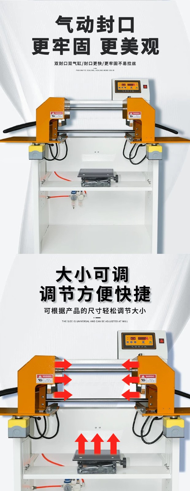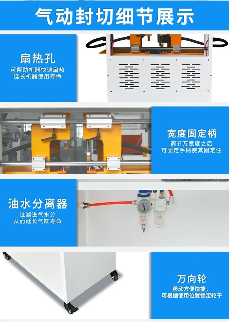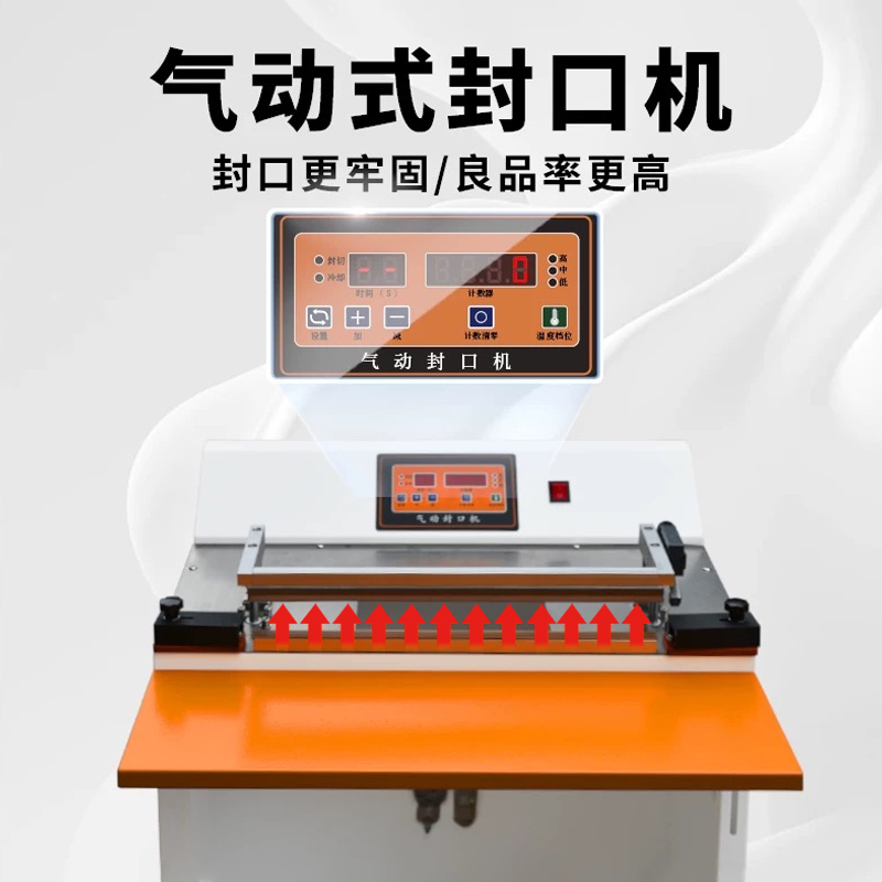 - 封口原理:通過氣動裝置產生壓力,將待包裝物品的塑料薄膜袋口部位壓緊,然后利用加熱元件對袋口進行加熱,使薄膜受熱熔化,在壓力作用下實現封口。