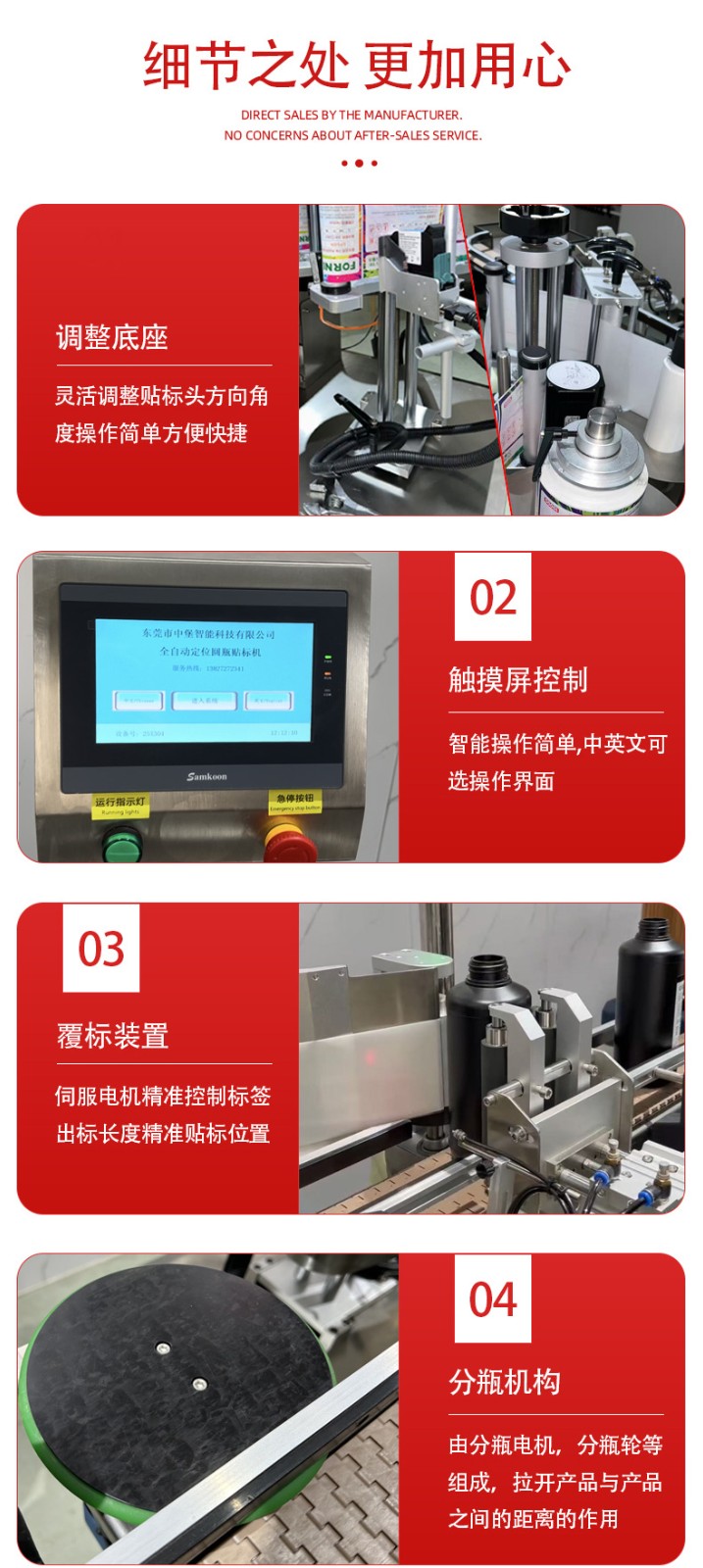 - 貼標:當圓瓶到達貼標位置時,貼標機構的標簽牽引裝置根據預設的標簽長度,將標簽從標簽卷上牽引出來,貼標頭在控制系統的指令下,將標簽準確地貼附在圓瓶表面。同時,壓標裝置對標簽進行壓實,使其牢固地粘貼在瓶身上。