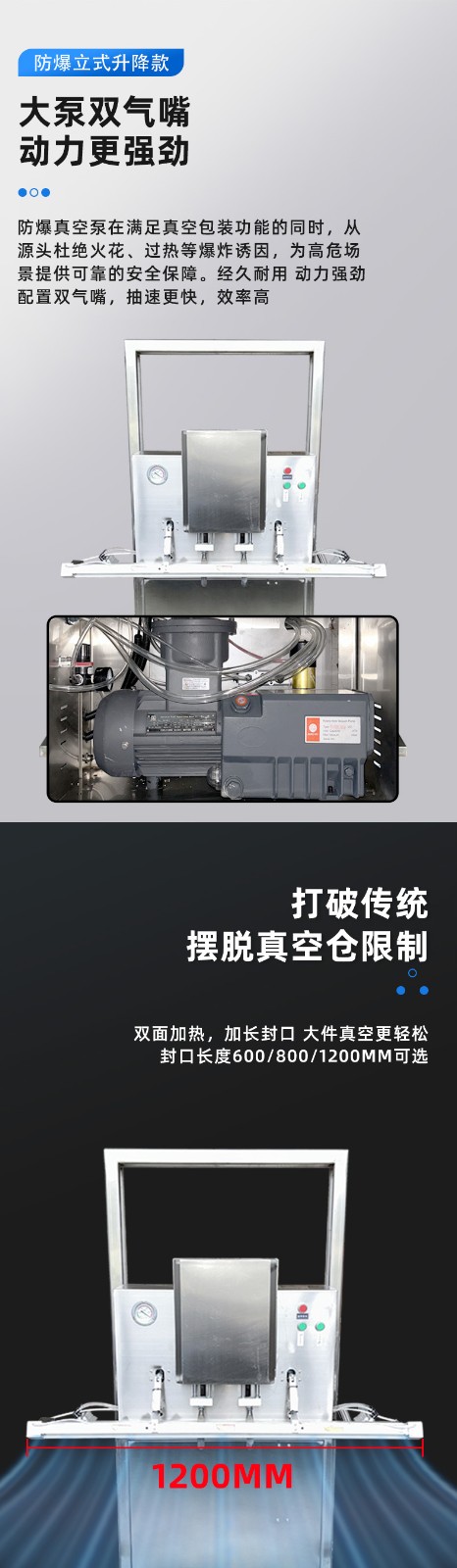 - 防爆性能優越:采用物理隔離防爆技術,嚴格選用防爆達標元件,電器箱、真空泵、熱封條等都經過特殊的防爆處理,能有效防止在操作過程中產生火花,避免爆炸等危險情況的發生2。