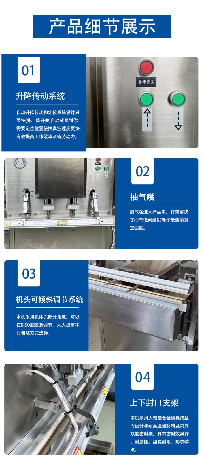 - 操作簡便:通常配備 PLC 觸摸屏控制,人機交互界面友好,操作簡單直觀,工作人員可以方便地設置各種參數,如真空度、封口溫度、封口時間等,降低了操作難度,提高了工作效率
