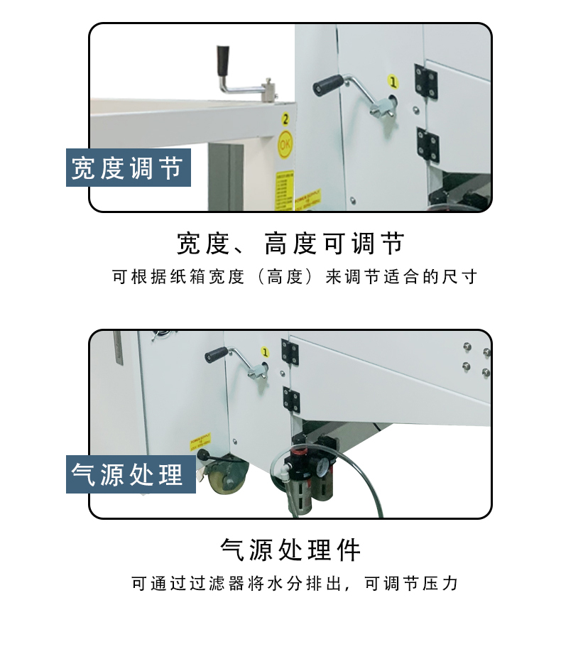 - 熱熔膠封底系統(如果是熱熔膠封底):主要有熱熔膠槍、膠量控制裝置和溫度調節裝置。熱熔膠槍的噴嘴形狀和角度要根據紙箱底部的形狀和封底要求來設計,以保證熱熔膠能夠均勻地涂抹在折頁上。膠量控制裝置可以根據紙箱的大小和材質來調節熱熔膠的用量,溫度調節裝置則要確保熱熔膠能夠保持在合適的熔化溫度,既不會因為溫度過低而無法熔化,也不會因為溫度過高而影響膠的性能。